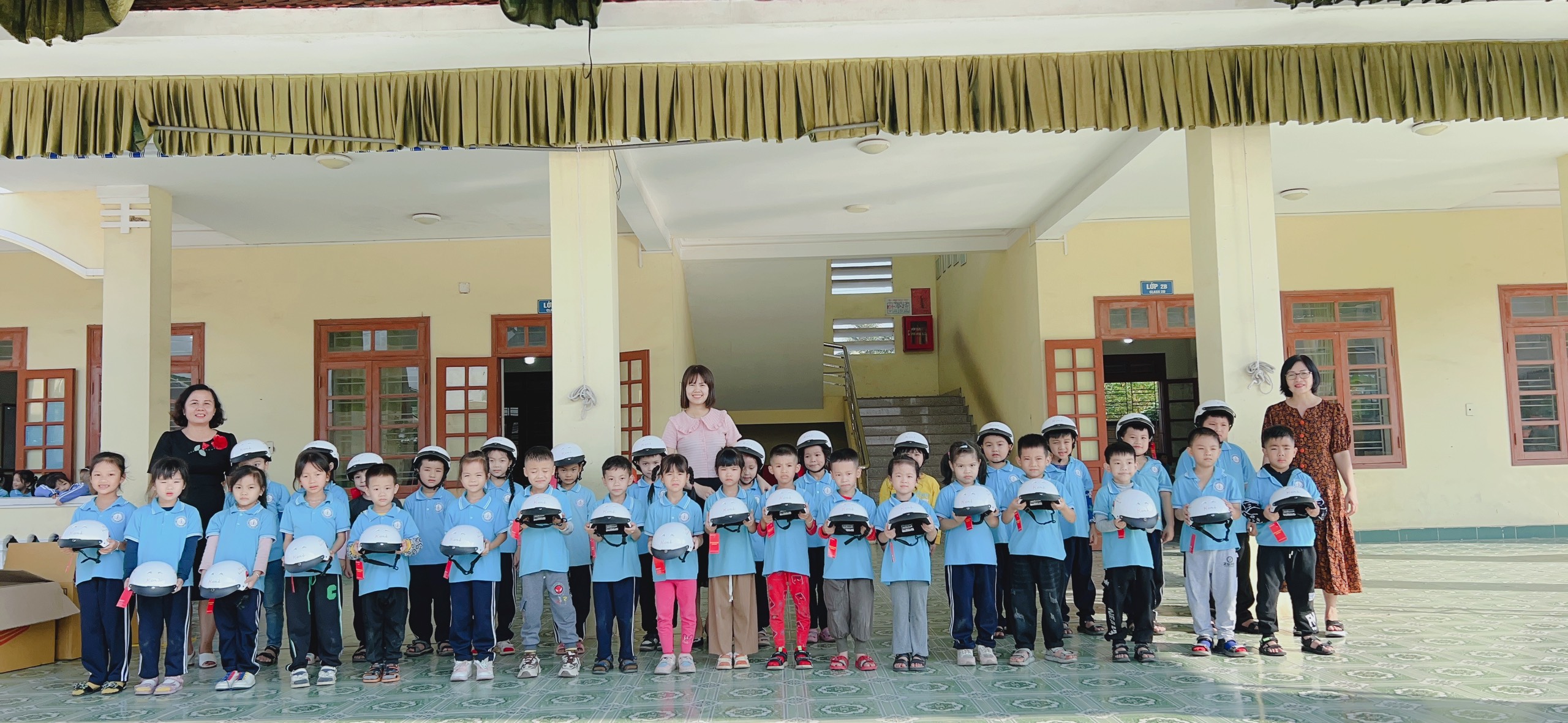 Học sinh lớp 1 hân hoan đón nhận mũ bảo hiểm chính hãng do Công ty Hon đa trao tặng
